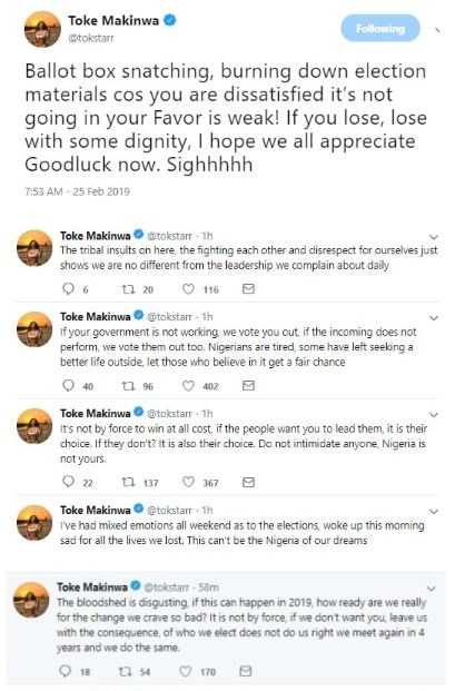 Nigerian radio personality, television host, vlogger, and author, Toke Makinwa has ranted about the sad political situation taking place in Nigeria as election results trickle in from all parts of the country.