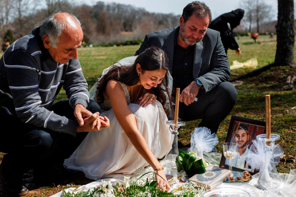 Clad in a wedding dress, Sara Baluch mourns while visiting the grave of her fiance, Mohammad Sharifi, on Sunday, March 10