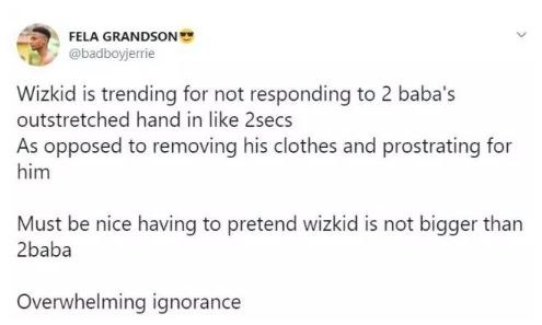 When we say Wizkid is arrogant, his fans will call us haters. How can you greet 2 baba like that