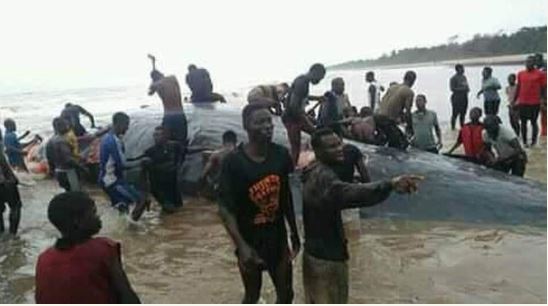The whale was reported to have been swept to the shores of the beach at the Okpoama and Onyekia communities in Brass Local government area of Bayelsa State on Sunday 28/07/2019.