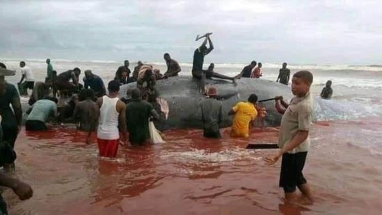 A whale was unfortunate enough to walk into the vicious hands of some locals who dissected its meat for consumption.